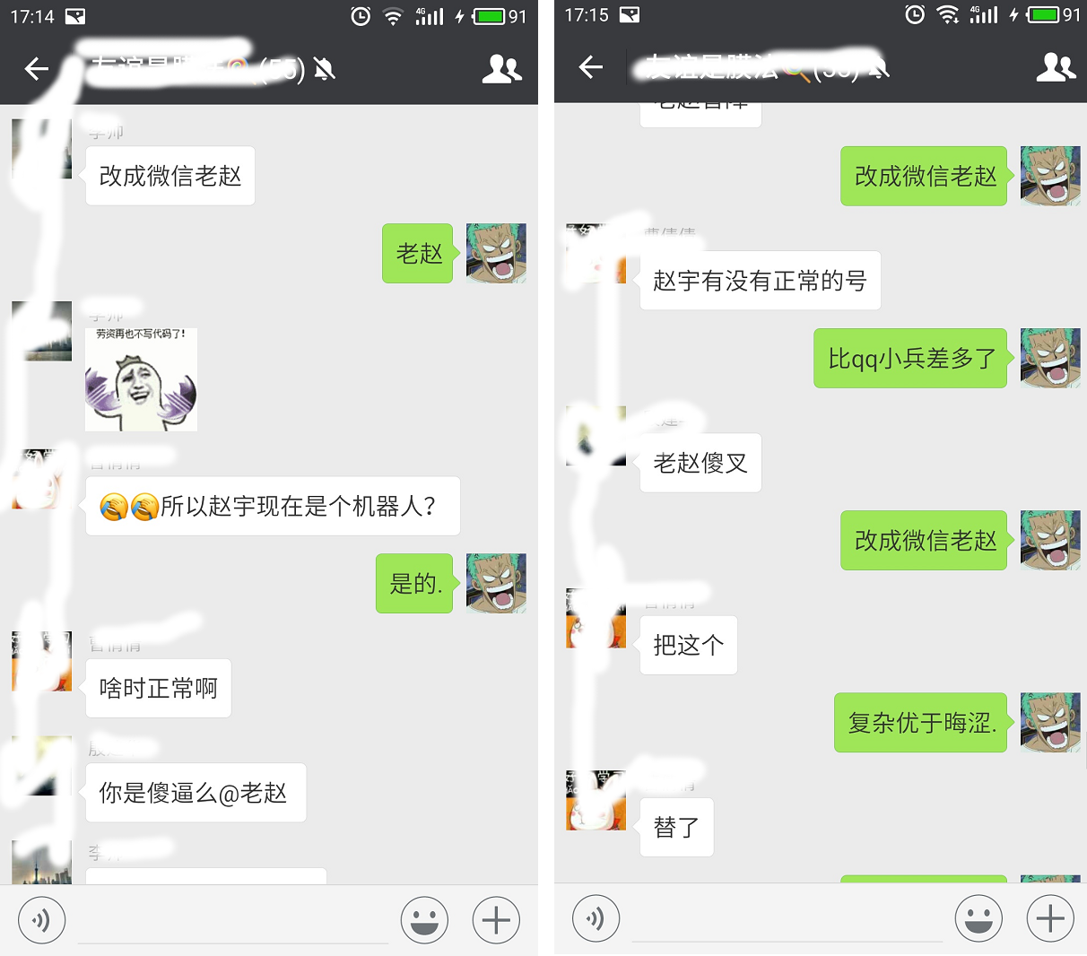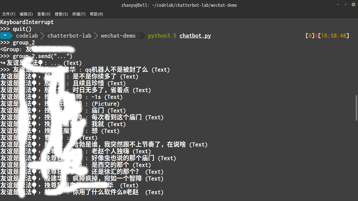 - Demo中机器人对每句话都做了回复,可以增强其表现,比如只回复@了自己的以及语料库匹配度比较高的消息(对应实际情景中聊天者比较熟悉的话题),这样就更能以见乱真了。