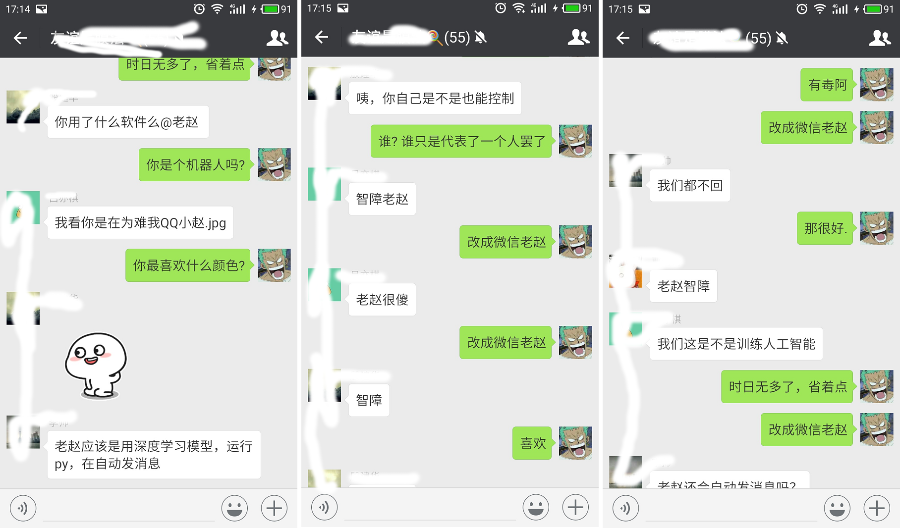 - Demo中机器人对每句话都做了回复,可以增强其表现,比如只回复@了自己的以及语料库匹配度比较高的消息(对应实际情景中聊天者比较熟悉的话题),这样就更能以见乱真了。