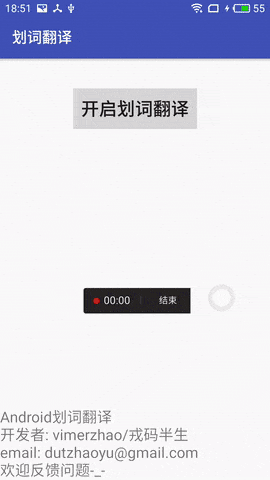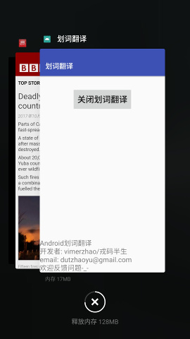 理想情况时我关掉APP之后,这个翻译Service仍然在运行,但实际测试发现只有在Nexus4上可以,在魅蓝Note2和小米6都失败了,说明厂商修改了ROM,要实现此功能还需进一步研究。