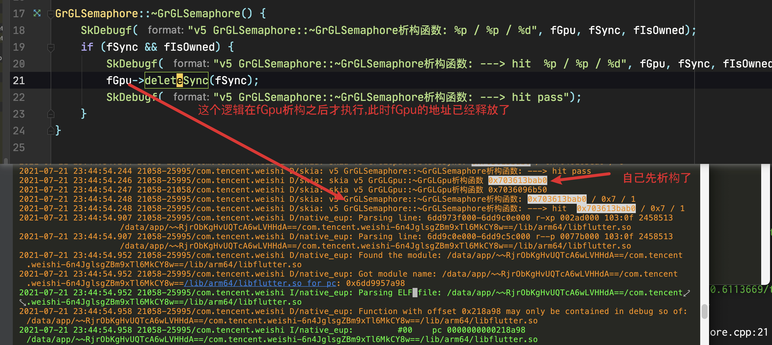 GrGLSemaphore的析构函数,访问到fGpu(第2步中已经销毁)的非法内存,报错