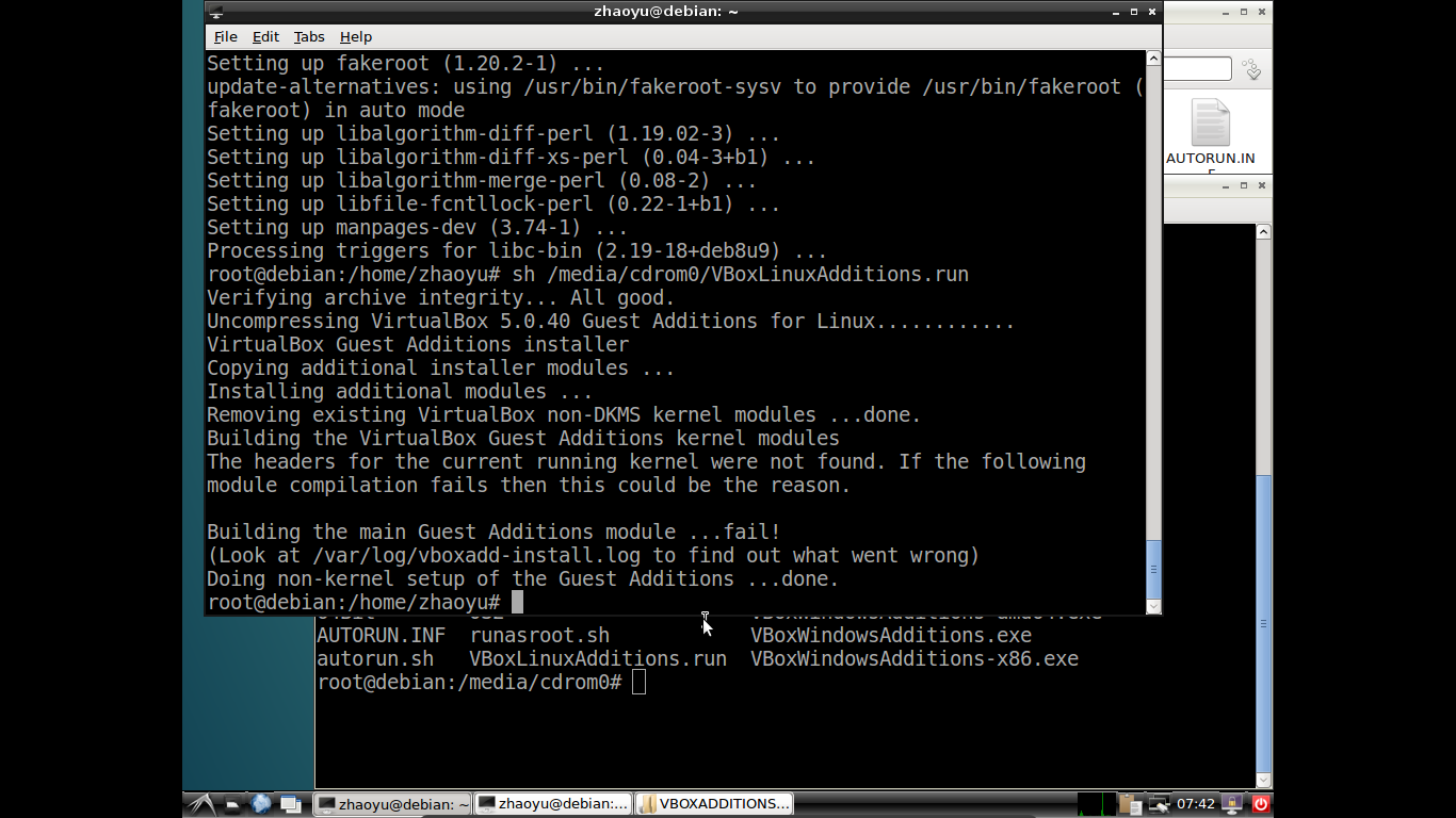 之前写过一篇博客记录了VirtualBox下安装增强功能的问题,是在Ubuntu上,当时主要是VirtualBox的问题,这次客户机是Debian,情况稍有不同,因为Ubuntu操作比较傻瓜式,基本自动安装,Debian就需要手动配置,还可能是因为我下载的安装版本比较精简(比Ubuntu少了几百兆),所以缺失了一些依赖。故此 ,花了些时间才得以解决。